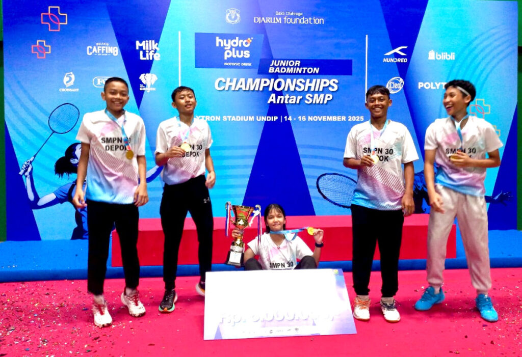FEM DEPOK – Tim bulutangkis SMPN 30 Kota Depok tampil gemilang dan sukses menjadi juara pada Kejuaraan Bulutangkis Beregu Antar SMP HydroPlus Badminton Championships 2025 yang digelar di Polytron Stadium Universitas Diponegoro, Semarang, Jawa Tengah, pada 14–16 November 2025.