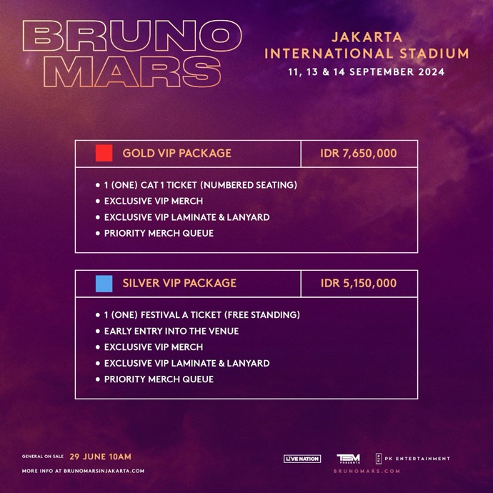 Sementara untuk penjualan Umum ketiga jadwal konser akan dilangsungkan pada hari Sabtu, 29 Juni 2024mulai pukul 10:00 WIB (Waktu Lokal Jakarta) hanya di brunomarsinjakarta.com.